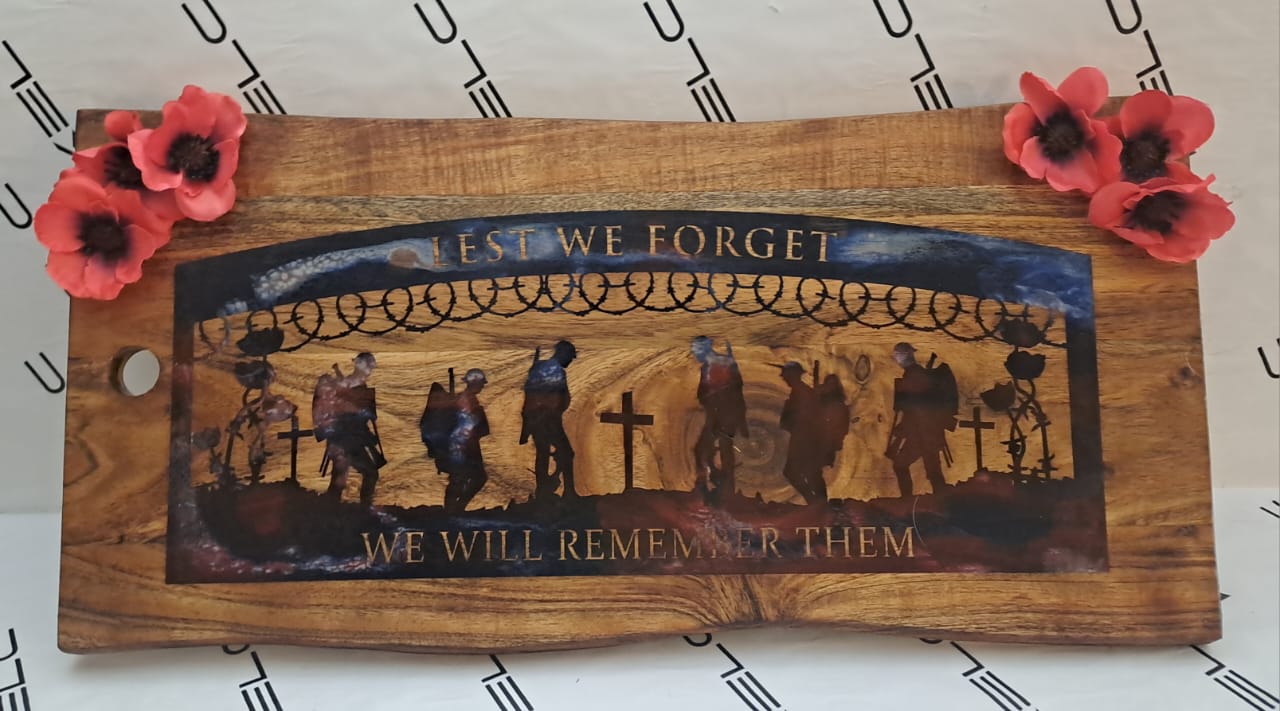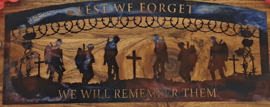 Honour and remember with the Twilight Tribute Platter, a truly unique and poignant memorial piece. Expertly crafted from premium Acacia wood, this platter features a natural live edge and a rich, durable grain that makes each board one-of-a-kind. The deeply carved engraving captures a powerful scene of soldiers in solemn reflection, set against the backdrop of crosses and barbed wire, with the timeless phrases "LEST WE FORGET" and "WE WILL REMEMBER THEM."